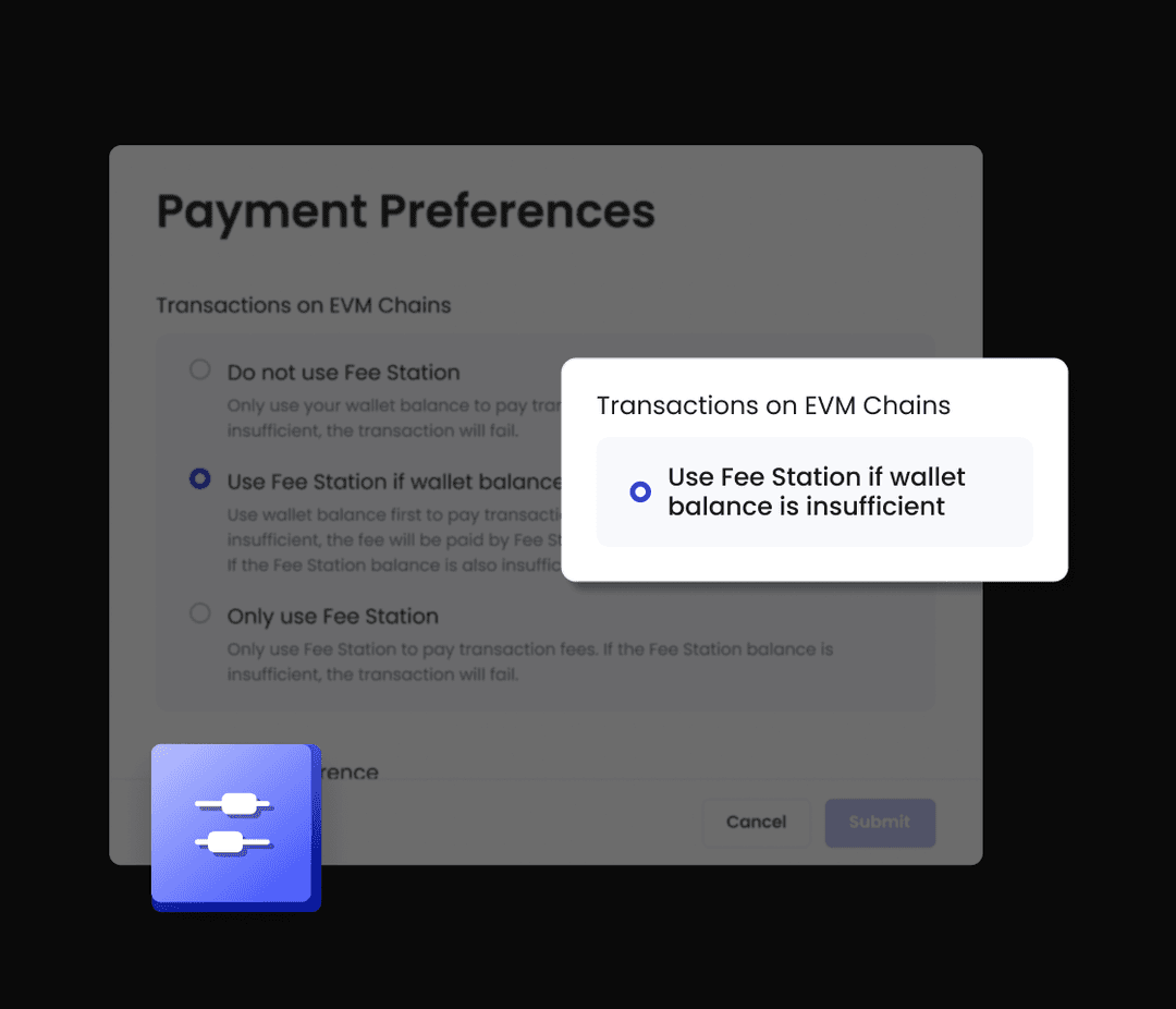 Configure Fee Station to cover gas fees for every transaction, or only when your wallet lacks sufficient gas tokens or stablecoins.