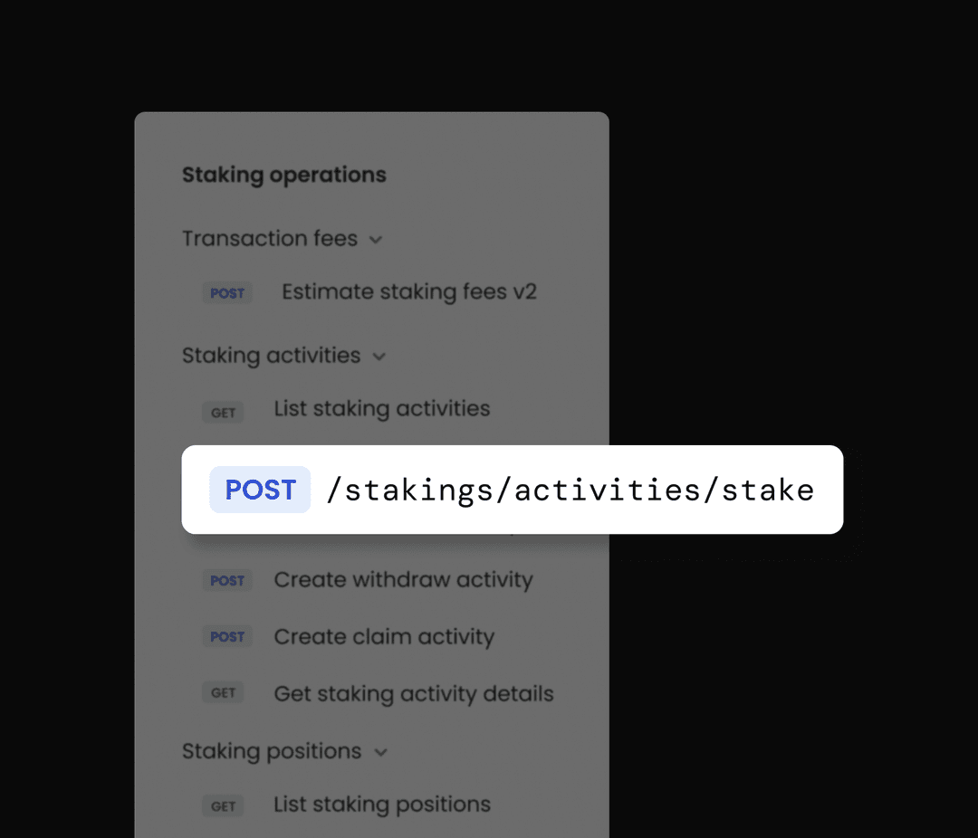 Scale your staking operations with our Staking API. Automate high-volume tasks, maintain programmatic control, and quickly integrate staking into your existing systems.