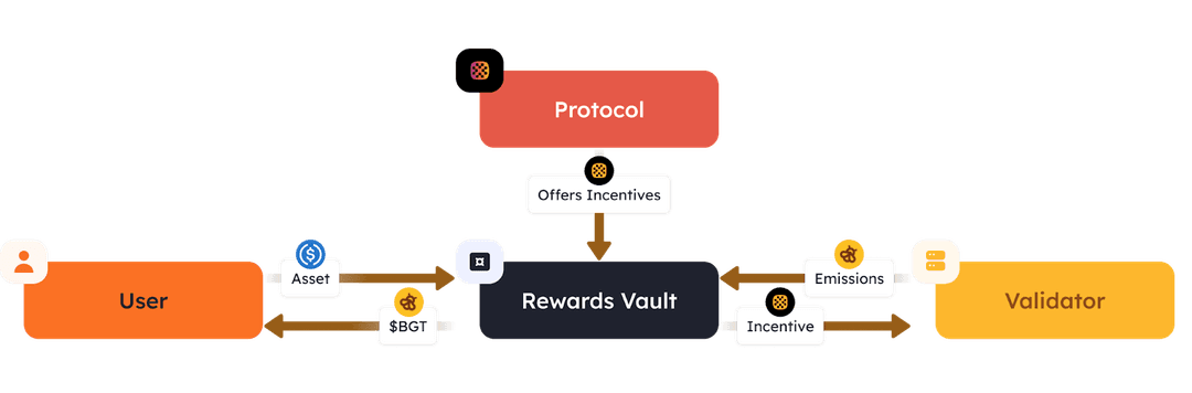 How Berachain’s Reward Vault System Works: Protocols offer incentives to vaults, validators allocate emissions to vaults, and users contribute liquidity—creating a market-driven approach to staking rewards.